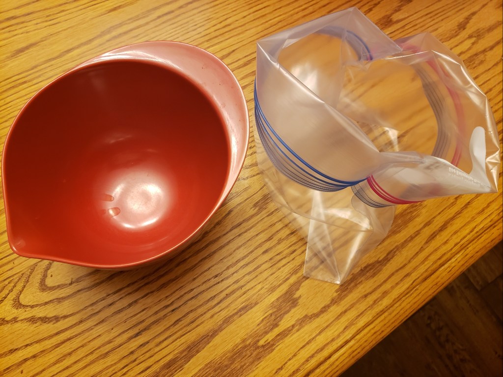 When I am prepping a lot of meals, I will rest the freezer bags in a bowl for easy filling, it doesn’t really matter what size the bowl is so long as it supports your Ziploc bag. I have also found that folding over the top zipper edge of the freezer bag helps to keep the zipper clear of food so that the bag can create a better seal. It’s also great for holding the bag open, which saves me time when I am adding my ingredients to many bags in a row.