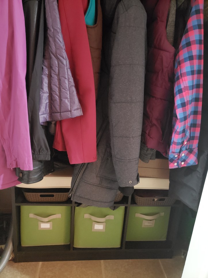 It has been sooo much easier to keep the front hall organized! My goal has always been to not need a secondary storage place, or seasonal transition storage space. I am generally needing gloves or hats long before I would otherwise transition the stuff. Even needing warmer or cooler coats as unseasonal weather changes occur. Lately, we have needed spring jackets through the early part of winter mixed in with real winter gear. Shoes too, sandals are good until it rains, or until the random snow storm in October.