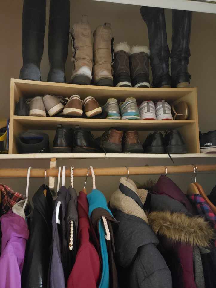 In case you didn’t see my posts about The Purge, there’s a chance that I may have a bit too much stuff still. Regardless, I would still like to keep my kids shoes (and maybe at least one kind of boot), coats (of a couple thicknesses), backpacks, and even hats and gloves by the front door. There is no way it will all fit in my small front hall closet.