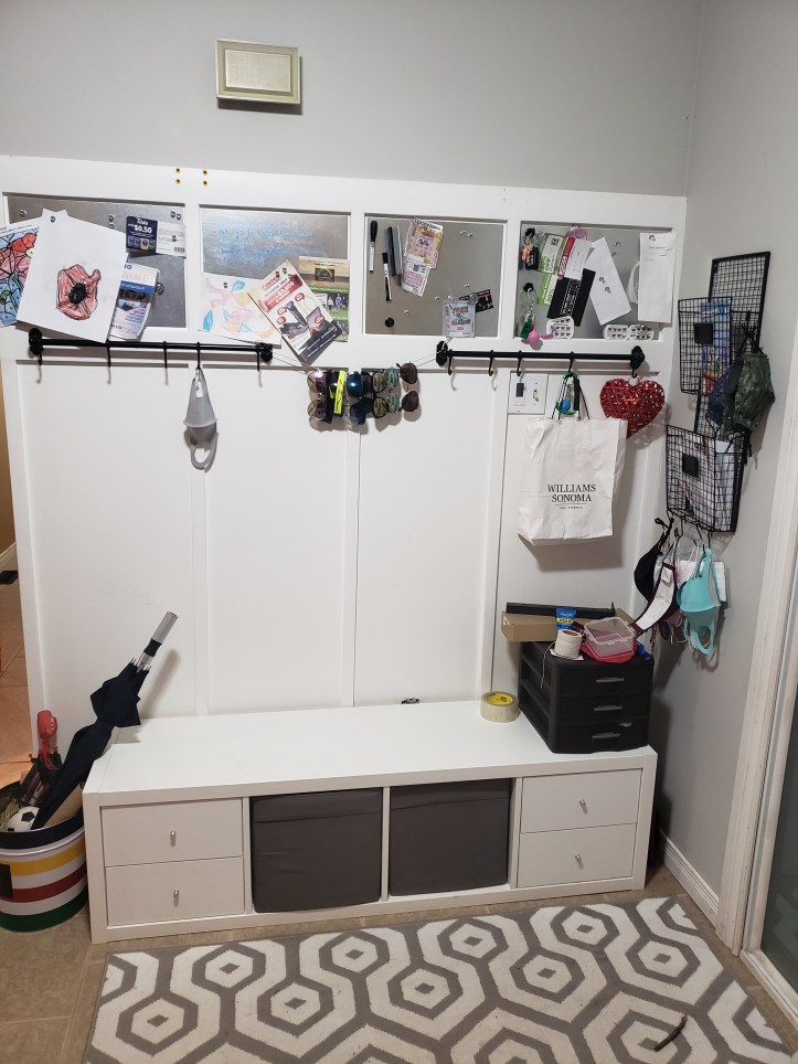 I decided to make a decorative wall, and use a cubby unit as a bench and shoe storage. It has been great. The thing I love about the unit is that there are some drawers built in that I can use to store socks right at the front door! I don’t know how many of you like socks, but anyone who knows me, knows I am a bit anti-sock! *Try A LOT!! So I find myself last minute running up the stairs to get socks. My kids take after me a bit, and they tend to get all their snow gear on, then try to put on their boots, only to find they don’t have socks! So I am the one running to get them socks too! It’s been so great having them right at the door!!