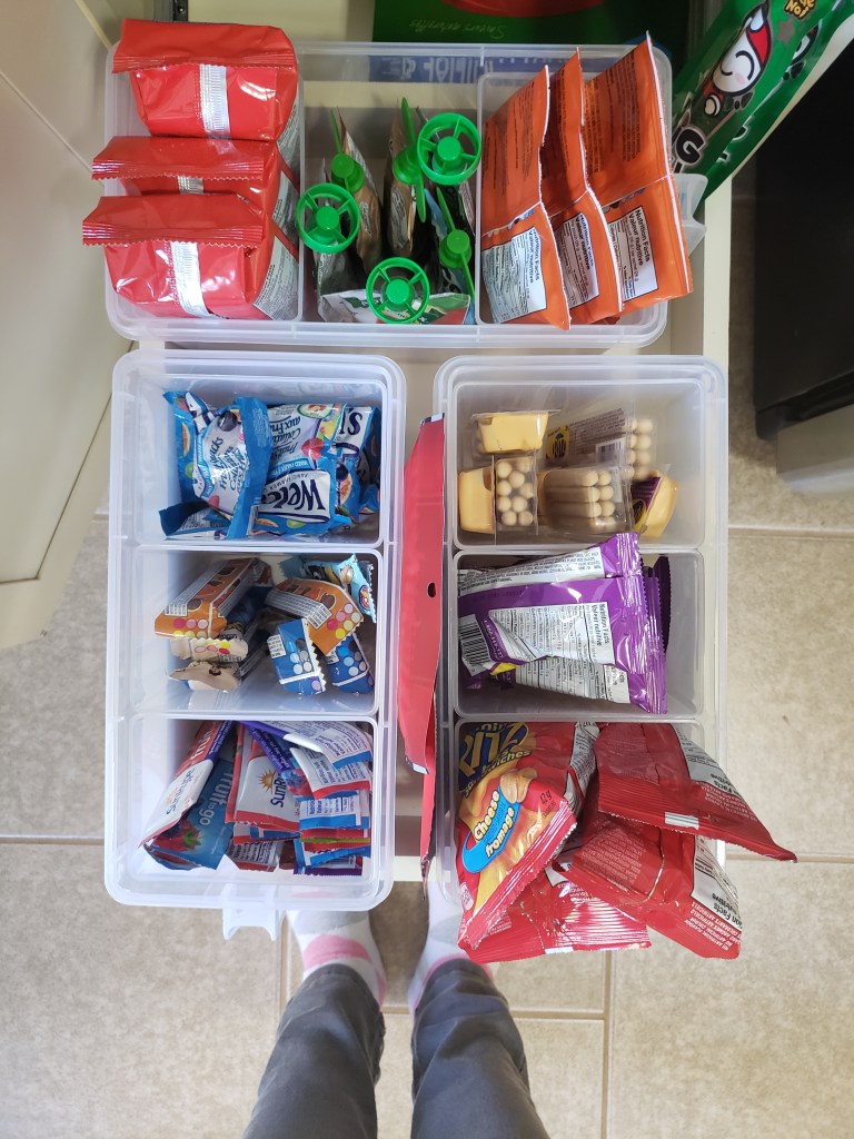 There were some growing pains and sometimes there still are. My favourite thing about it is that the boys are so used to it, that when school is not on, like PA days, or virtual, they still go there knowing they can help themselves if they’re hungry. That way I am not always in charge of when they can eat. Or I am not having to make 7 snacks per day!! They know that if they’re hungry they can grab two fridge snacks, then escalate to a cupboard snack if the fridge snacks didn’t curb their hunger. I make them alternate between the two fridge snacks and the cupboard snack until they are satisfied, or until break time runs out. I often add some yogurt cups, tubes, or drinks; whatever is on a better sale.