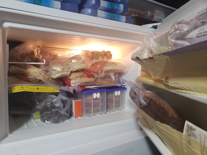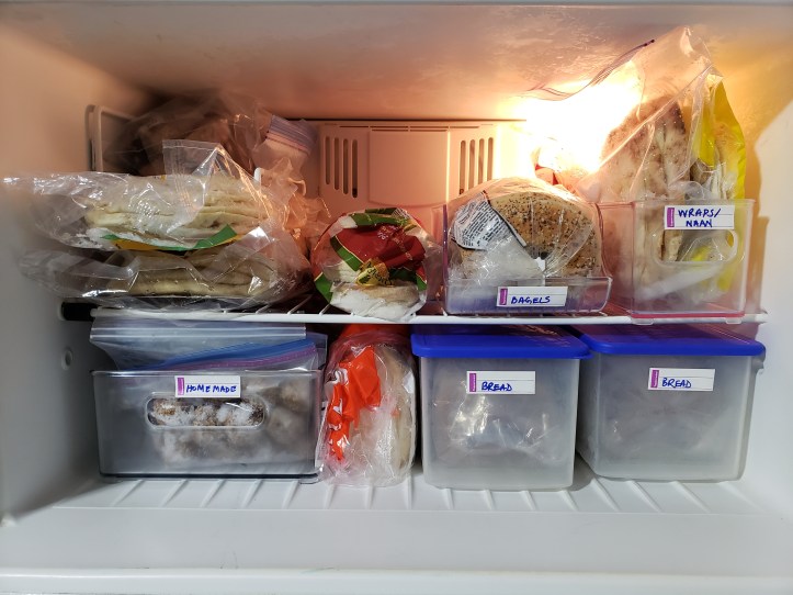 I know not everyone is as lucky when it comes to freezers, or even space to keep the freezers! Maybe some of you only have the small freezer in your fridge in the kitchen, but don’t let that stop you from freezing your food! Maybe you get mostly fresh produce so that you can have more meat in the freezer. Maybe you can still make some easy to reheat meals. Maybe instead of making things for the next few months, you simply cover enough for one month. Maybe you buy store baked cookies or butter tarts and toss them in the freezer so that you don’t accidentally eat them all in one night…. It’s surprising how little space you need if you plan it right. Some chicken, some ground meat, and some seafood can be enough stretched out to cover many meals! Add a loaf of bread to the freezer and it will still be good in a couple weeks for when the fresh loaf is gone (Pro tip: place your bread into a container or another bag to keep freshness, you can even keep reusing the same bag!).