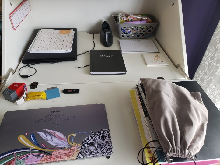 So, I started piling it all in different spots then basically taking it to the trash and recycling right away instead. I started to use the ledge of the window to put some of the extra notebooks and pens, thinking that the dog wouldn’t get anything from there…Well, the next time I turned around, there she was, with a pen sticking out of her mouth! If she wasn’t so fast, I would have snapped a few photos.