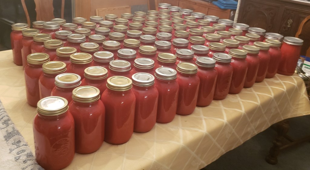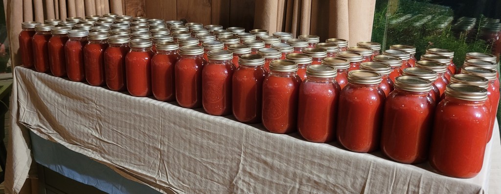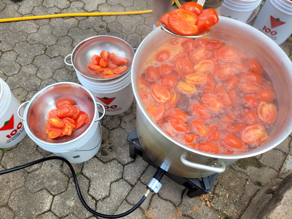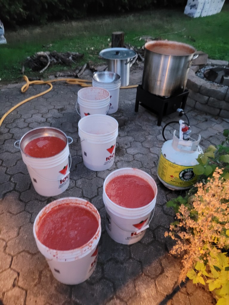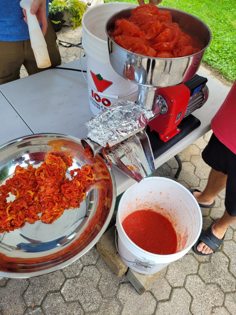 Another year flies by and now we are committed! We have our industrial mill, we have two large propane burners and two pots that each hold over 100L, we have two stoves going with sauce thickening and different canning pots on each stove, we got started earlier and we had a few more people to help us out. We increased the amount of tomatoes to 10 bushels!!