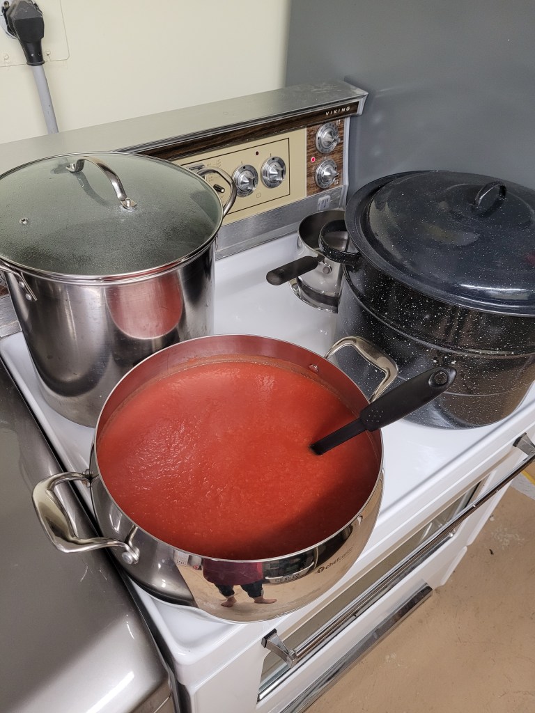 We started 3 years ago, in my friend’s kitchen, making a bit of sauce while the kids were in school. We had a small hand mill to help us easily mash up some tomatoes. We were working on one stove filled with a single canning pot, a pot for lids, a sauce pot and an extra pot of water to top up where it was required. That was when we were thinking, hey this is fun! We should do more of it next year…Like maybe make a day of it!