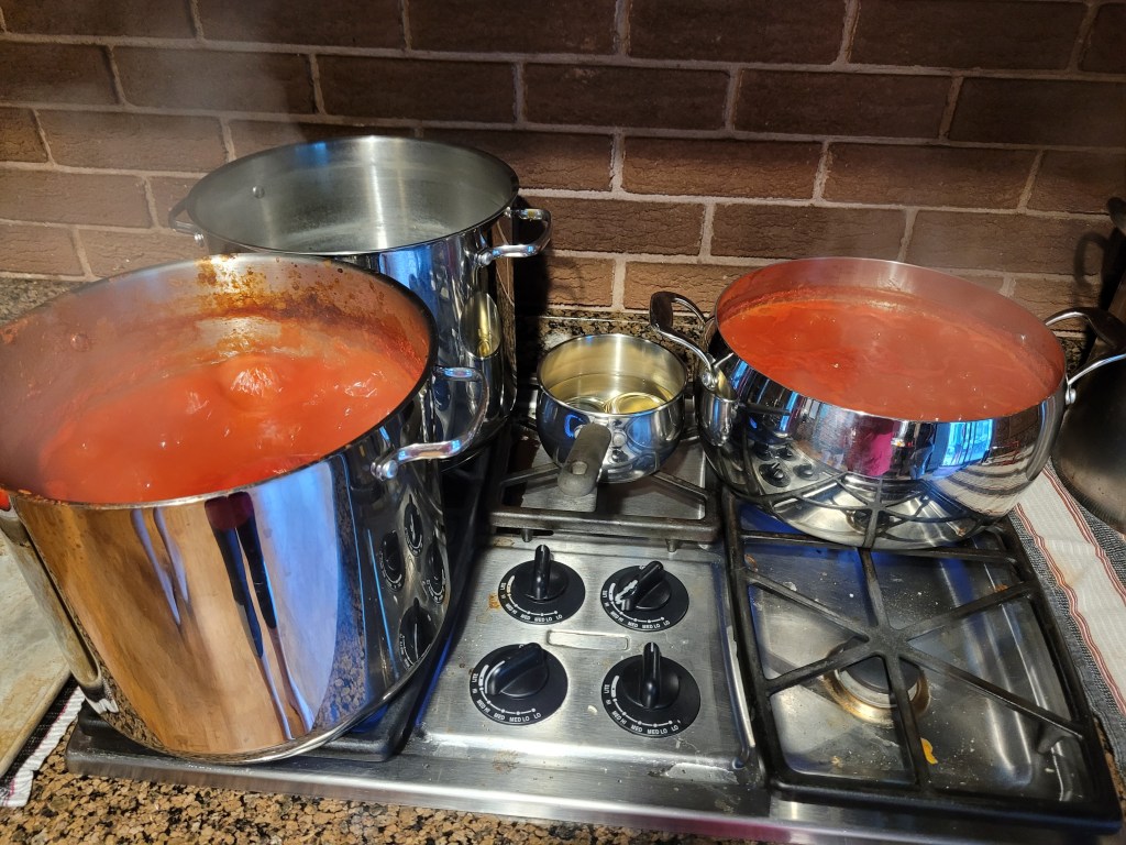 Fast forward a year to the second annual, but first of the mass production sauce days! After some investment into a real industrial type food mill, we got a bit more serious about how much sauce we could make. We went out in the morning and bought A LOT more tomatoes than the previous year. We worked on the weekend so that we didn’t have to worry about school pick up or drop off, and we got right into it! We ended up making almost one hundred(!!) 1L jars of sauce. We had been working all day long, and I ended up heading to my own house by about 4:30 in the morning! While thickening the sauce we hashed out some efficiency details for the following year. Staying up until 4:30 makes for a long day! So we had to change a few things. Overall we were very excited about perfecting the system for next year.