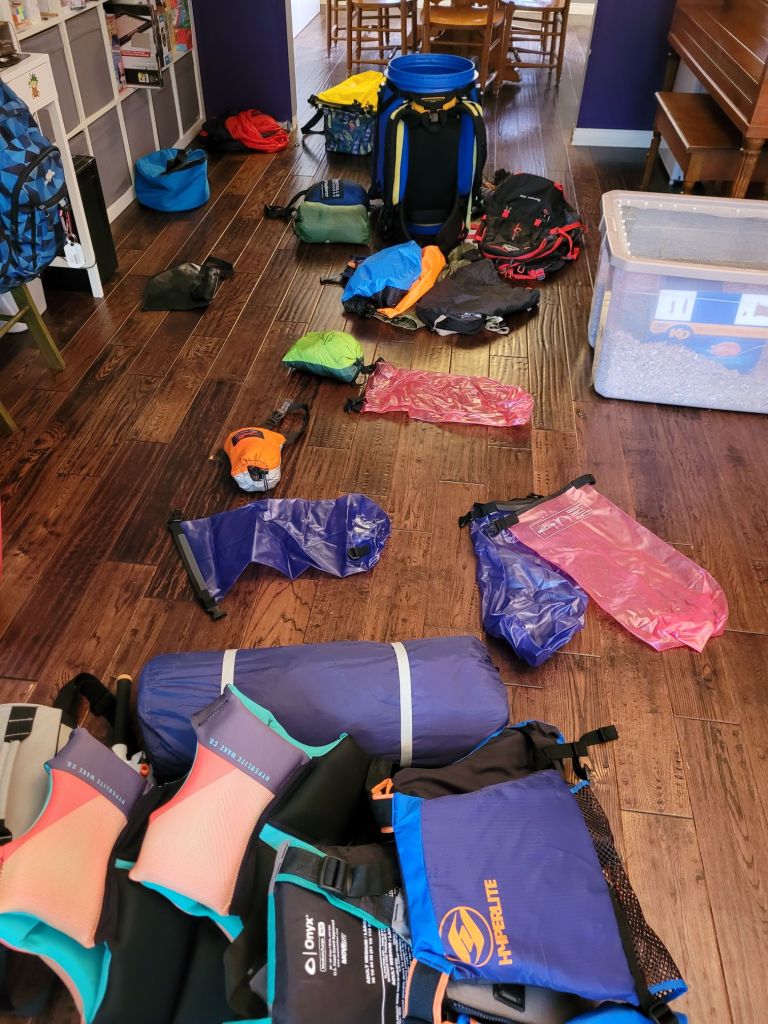 So, another canoe trip is on the horizon. One of my favourite ways to get organized for any kind of camping trip is to gather all the equipment that I think I need and dump it somewhere in an open space. I use it to visualize how much space the gear will take up and use it to estimate what will fit best in what pack.