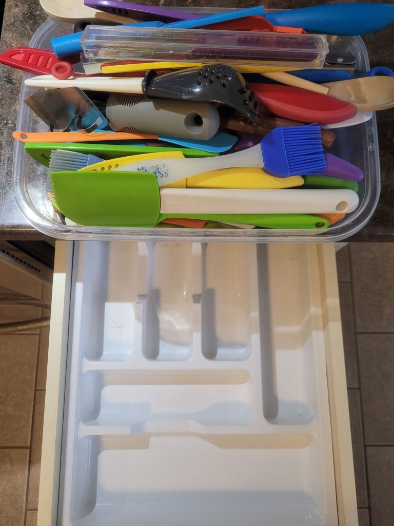 This is a great opportunity to pull out any organizers, clean them, and even decide if it’s worth keeping them. I decided to hold onto this one for now, in case it’s useful, but I do have my doubts with the long shaped knives and spatulas from the drawer. Once the deadline is reached, it can go with the rest of the contents of the Room-box if it’s deemed useless!